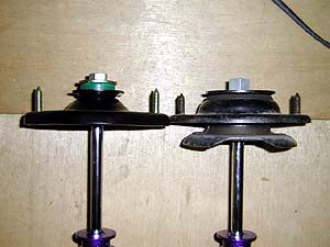 左がNB用、右がNA用。NA用はスプリングの受けとボディの間に分厚いゴムが挟まるのだ。このゴムがブルブルと揺れる。NBはリジットマウントだ。NBに乗るとあのブルブル感がとても少ない。これはボディ剛性が高いってのも有るんだけど、リジットマウントに変更になったアッパマウントの構造の違いによるところが大きいのではなかろうか? 事実、NAにNBアッパマウントやピロアッパを付けるとブルブル感は大幅に減るのだ。もちろんボディ補強無しで10年経ったNA6だったらアッパマウントだけリジットにしてもボディそのもののブルブル感は有ると思うが。