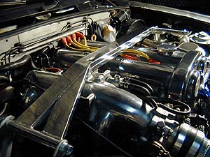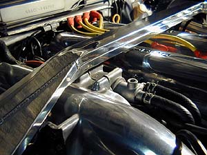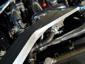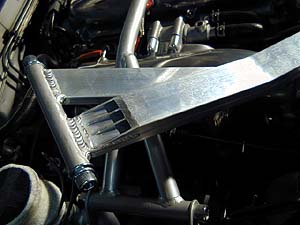 ロードスターのタワーバーは剛性アップ効果が無い(或いは無きに等しい)モノが多く市販されている。ロドスタはサスタワーが低い位置に有ってエンジンが高いので、エンジンを避けるように大きく湾曲させなければならない。この結果、バーには引っ張りや圧縮方向の力ではなく、曲げの力が掛かってしまうのだ。どんな素材でも引っ張りと圧縮にはめっぽう強いが、曲げに対しては非常に弱い。曲げに対向するには素材そのものをかなり強力なモノにしなければならないのだ。真っ直ぐに突っ張りを入れる事が出来ればかなりの補強になるのだが、どうしても曲げなければならないロドスタの場合、本当に効果的な補強としてのタワーバーは数少ない。真っ直ぐなバーにするとブラケットの高さがかなり高いモノとなってしまい、ブラケットの剛性が問われる。ブラケットを低く設計するとバーが大きく曲がってしまうのでバーの曲げ剛性が問われる。市販のアルミタワーバーなどは単なる飾りに過ぎないモノが多い(笑)。自分のクルマに付いているバーを手で上下に揺すってみてほしい。大抵の製品はグニャグニャと動くハズだ。手で押した程度で動いてしまうようなバーでは補強効果は無いと言えるだろう。残念な事に市販製品のほとんどはコレだ。