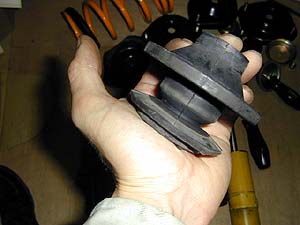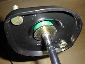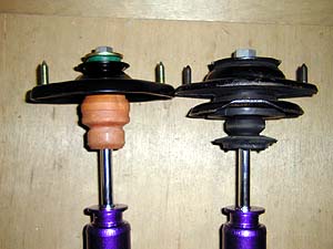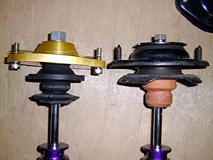 ダンパは両方ともNA用だ。右がNA用アッパマウント、左がNB用アッパマウント。解かり易くする為にバンプラバなどは付けずに比較した。ご覧のように右のNAアッパはスプリングのアッパシートとボディ側マウントとの間にラバーが存在する為、スプリングシートがボディ端面から20mmほど下がっている。NB用アッパはスプリングがボディ側マウントにリジットマウントとなる。スプリングがリジットマウントになる事により、ダイレクト感は増すと思われるが、乗り心地の面ではどうなるのだろう? NBが純正でこうなってるんだからメーカレベルの基準でも乗り心地の面では問題無いのだろう。が、スプリングの上面が20mmほど上に上がってしまう為、同じスプリングでそのままNBアッパをNAに流用すると車高が20mmほど下がってしまう。実際にはNAアッパも1G荷重でラバーが縮むのでその差は20mm以下となるカモしれない。NBアッパはダンパのロッド先端が串ダンゴブッシュによってマウントされる。この為、NB用ダンパはロッド先端が長くなっている。