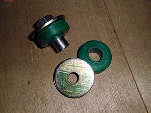 ロッド先端の形状が違うと言う問題を解決するのがコレだ。NOPROのカラーとブッシュである。串ダンゴブッシュを貫通する長いナットと薄くて硬い串ダンゴブッシュ。コレを使うとNB用アッパマウントがNA用ダンパにそのまま使える。NBにNA用ダンパを使う場合にも有効だ。