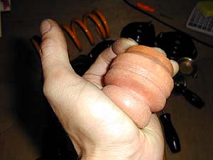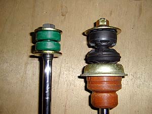 左がNAダンパにNOPROのカラーと串ダンゴブッシュを通した状態、右はNBのノーマルダンパにノーマル串ダンゴを付けた状態。茶色いのはバンプラバーなので無視してOK。NOPROのヤツは薄くて硬い強化タイプの串ダンゴになっている。だが、これを使ってNBアッパをNAに流用したメリットはどんなモンだろうか? 一説によるとストロークがアップするとの事なのだが? ここで言う「ストローク」とは1Gから底突きまでのスロトークの事。要するに底突きする位置が上にいくのかどうかって話だ。以下同様。