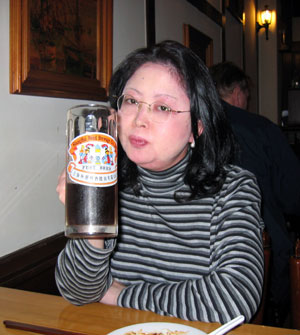 結局今日は10時間以上車中にいた。反省(後悔?):次回は列車で行き、タクシーを利用しよう。 すっかり遅くなったので、ホテル近くの外灘ビール(右)。黒ビールはフレッシュでまろやか。ギネスのようなくどい甘さや焦げ臭さは全くない。お土産に買ったジョッキ(下)。