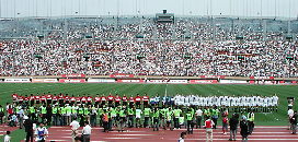 聞いていた話から想像したのはこんな不思議な風体の男たちが場内をウロウロとしてはモニターを見せて歩いて人を仰天させる、ってものだったけど歩くとゆっくり見てもらえないって問題があるのかそれとも重さに「モニターマン」の中の人がバテてしまうのか、ペプシのブースの前に並んで立ったまんま身じろぎもせず仏頂面で直立しっ放しだったのが拍子抜け。けどまあ実物を見て置いてよかったよ、間違ったことを書かずに済むんで。評判の方はといえば最初のうちは何人か、囲んで記念写真を撮ったりしていたけれど仏頂面が怖かったのか試合開始前とかハーフタイムで近寄っている人はおらずモニターを見入っている人もいなかったから、どれだけ効果があったかは微妙なところだったりするけれど。