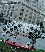 結局のところ何かと言えばどーも世界中の都市でときどき開催されていたパブリックアートイベント「カウ・パレード」ってのが「丸ビル」のオープン1周年を記念した行事の中で日本に持ち込まれたって感じで、なるほどだから場所も「丸ビル」を中心にした一体が選ばれているみたい。とにかく色とりどりで形もいろいろで、サンケイ前の全身が人工芝で覆われているものからペインティングに凝ったものから内部を空洞にしてそこに人形を挿入したものからいろいろな牛がいて、大変だけど次はいったいどんな牛なんだろーって捜して見に行く楽しみがある。