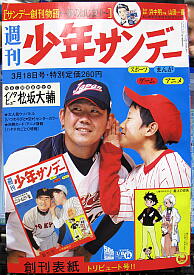 【3月4日】 駅に寄るとそこだけ空間が昭和30年代になったような空気が漂い流れていたのに目を見張り、キオスクに近寄ると何と「少年サンデー」の古書が売っていた、じゃなくってまっさらの最新号なんだけれども、創刊号の表紙に使われていた長嶋茂雄が子どもから耳打ちされているポーズがそのまま松阪大輔に置き換えられた表紙になっていて、遠目に見れば区別がつかず今日はサンデー、入らなかったのかって思ってしまう人も出ちゃいそう。それはないか。