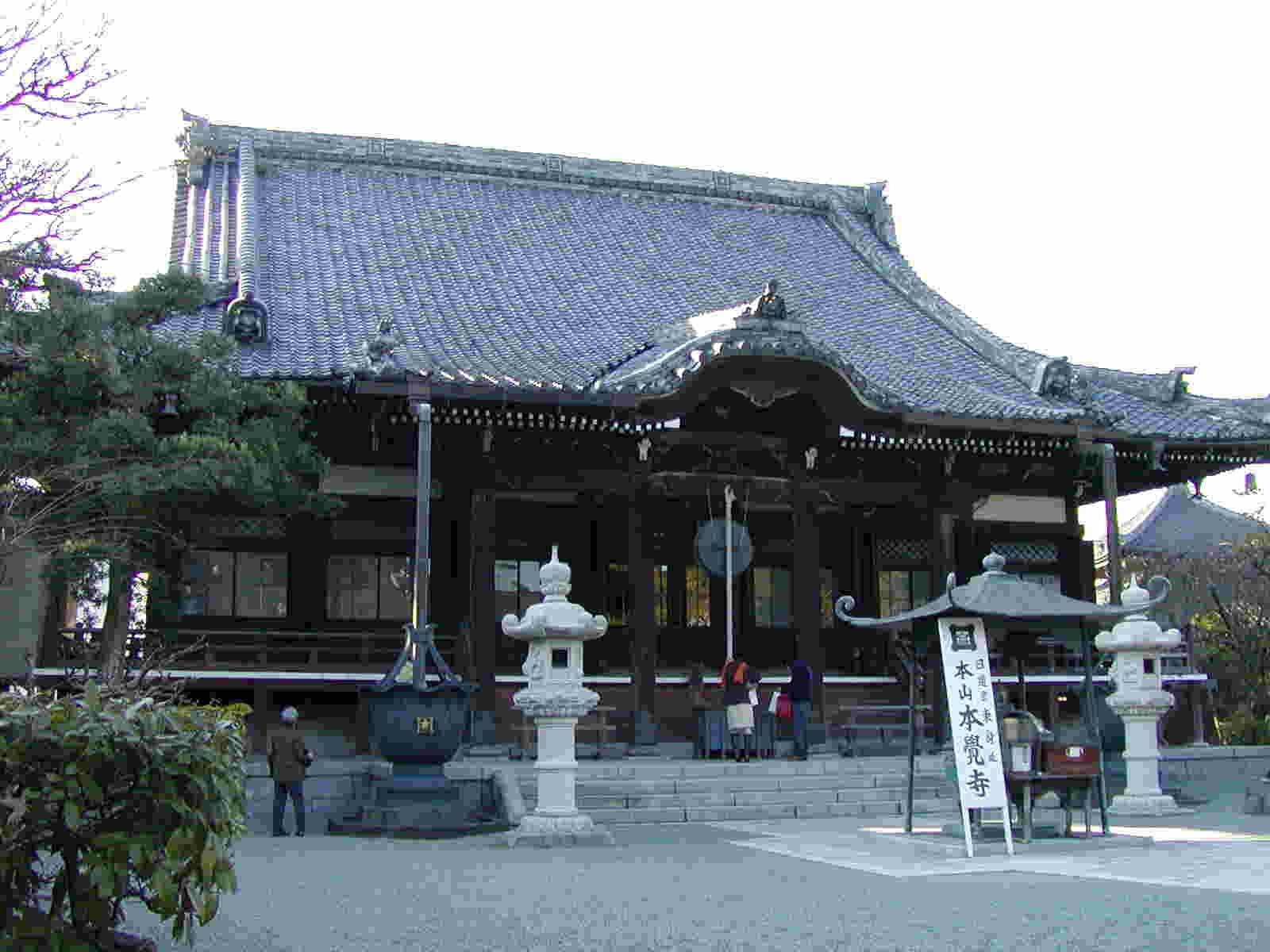 | 2002年1月1日 湘南便りその33:鎌倉散歩第7回 本覚寺 -------------------------------------------------- 新年明けましておめでとうございます。今年も「湘南便り」をご愛読願います。 前回は、「こ寿々」を紹介しましたが、今回は再び鎌倉のお寺さんを紹介します。 妙本寺を出て鎌倉駅方面に少し歩くと滑川(なめりがわ)に架かる夷堂橋があります。 その橋を渡ると直ぐ目の前に江戸時代の楼門造りである重厚な門構えがすばらしい本 覚寺仁王門が建っています。その門の両脇に立ちはだかる仁王像もかなり恐ろしげで、 これなら悪者も寄りつけないに違いないと思いました。 年の瀬を迎えると本覚寺(ほんがくじ)の境内は慌しくなります。境内のあちこちで 提灯を下げる用意がなされ、大きなやぐらを組み立てている職人さんの姿も多く見ら るようになります。本覚寺では、「鎌倉えびす」というお祭りがお正月に開かれるの のでその準備が行われるのです。 「鎌倉えびす」とは、こちらに祀られている夷尊神(えびすそんじん)に関係したもの で夷尊神の福顔にちなんで毎年20名ほどの「福娘」を選出し、1月10日の「十日えびす」 ではお披露目を兼ねて鎌倉中を人力車で練り歩くなどなかなか賑やかなお祭りです。 広い境内の正面には本堂があります。かなり重厚で立派な造りですが、残念ながら中は 堅く閉ざされてうかがい知ることは出来ませんでした。 本堂の右脇にはかの日蓮の遺骨が納められたという宗祖分骨堂があります。 日蓮の遺骨がどこにあるかなんてこれまで考えたこともなかったのですが、実際に目の 前に納められているかと思うと、歴史の重みにしばし圧倒されてしまいました。しかし 一番気になったのは、祇園大明神を祀っている小さな社でした。何やらあやしげな雰囲 気があり、豪壮なイメージの強い本覚寺にそぐわないところに面白みを感じました。 ちなみにこちらは病気よけの神として崇められているそうです。 今では本覚寺のシンボルとなっている夷堂(えびすどう)は境内の一隅にあります。 夷堂に上がるための石段を上がりますと、念願の夷尊神(えびすそんじん)にご対面出 来ます。堂内をのぞくと真っ正面に黒い夷尊像が見えます。中は薄暗くてえびす様自身 も黒いので、細かい形は判別出来ないのですが、逆に暗闇の中で微笑んでいるえびす様 が浮き上がってくるようでした。 私が訪れた時は11月半ばでして、境内でお年を召した方々が合唱をしておいででした。 なんとものどかな雰囲気で、つい、田舎のお寺の境内を思い出してしまいました。 |