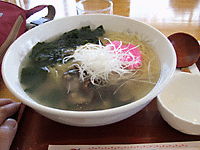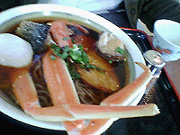 | 5月4日 7:00amの朝食後、江差に向かう。10:30江差からニセコへ。長万部付近の海鮮レストラン「漁師の家」には団体バスが何台も停まる。大食堂テーブルにはツアー団体客の昼食支度が整っている。写真は三枝子さん注文の海鮮ラーメン。 ![]() |