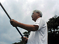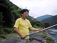 「どうも成果は期待できそうもないなぁ」と呟きつつ小比賀師匠が川に入る。狙ったところにおとり鮎を泳がせて持っていくのがポイント。なかなか難しそうだ。