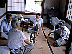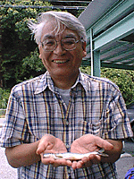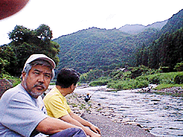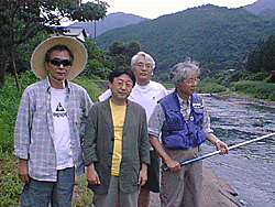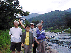 ところで肝心の鮎釣りの話だが、今年は大水が2回出て鮎が少なくなっていて、8月15日まではエサ釣りが禁止されているとのこと。オイラたちはエサ釣りの経験しかなく(前回参照)、友釣りなどできるわけがない。ここはひとつ小比賀師匠一人のみ入漁料を払って、われわれはちょっとだけ雰囲気を味わうことにしようと相成る。