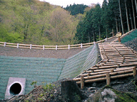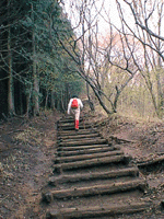 さらに少し行くと、岩茸石という大岩。名栗温泉からの道と合流、あと40分の行程。また、木を組んで整備した階段登り、しかし雨で土が流されて中央が凹んでいたりして歩きにくい。権次入峠(ゴンジリ峠)に到着、右手に曲がり、今度こそと思われる、頂上へ至る最後の長い木の階段。