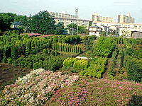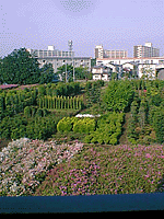 隣が造園業。ツツジのシーズンはこんな風景が窓の外、眼下に広がる。遠くに見えるのは、牧の原団地。