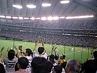 試合は阪神の勝ちムードに乗って、焼き鳥、枝豆、唐揚げをエサにビール3杯(いや4杯?)と盛り上がる。しかしそれが最終回、巨人・高橋由伸の逆転サヨナラホームランで暗転となるとは!!写真は3−1で阪神リード、おおいに3塁側が沸いているところ。試合後、2人で新松戸まで戻って駅前地下の「ひいき屋」で残念会、オイラが家に帰り着いたのは深夜0時をまわっていた!