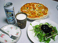 G5」の環境は上記の“満足そうな”近影写真の如し。いままでの「Macintosh Performa5430」もスキャナー、MOドライブ、プリンターとセットでピアノルーム兼書斎(?)部屋に鎮座する(=写真左)ことに・・・。夕方「ベルドムール温泉」で汗を流す。三枝子さん特製ピザ=写真右=と麒麟の淡麗アルファ・ロング缶を2つ。