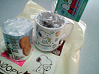 スマトラ沖の地震津波の死者数が拡大、5万9000人(TBSラジオ8:17)の情報。地震国日本では過去の苦い経験が数多く「津波」は英語ではそのまま「tsunami」と表現される。さて今日から休みだが午前中から初雪が舞い始めてあっという間に銀世界となる。夕方4時からピアノの忘年会、御徒町駅そばの焼肉居酒屋「ありが亭」に先生&生徒が集まる。最年長はワタクシ。でも一番若い鶴高君でも30歳だぜ。可愛らしいプレゼント交換会なんぞもあって、おいらには金津さんからのスヌーピーお菓子=写真=が当たった。ちなみにおいらが持参した「チョコラBB」「素肌美人」のドリンク劑は、熊谷さんがゲット!良かった良かった!2次会は会場捜し回ってビアホール「ライオン」の個室をゲット、帰宅22時30分。