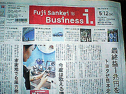 さて、わがHPからの“訴え”を見るに見かねて、「心優しいエイちゃん」様からフジサンケイビジネスアイの購読申し込みいただきました!!ありがとう(涙)!みなさん、エイちゃんに拍手を!!なお、某宅では「新聞とってあげてもいいけど、それで“しゅう”が平和なサラリーマン生活を4年半も過ごせるなんて、シャクにさわるわね」ということで沈黙していたそうです。いやはや・・、でもおかげさまで“ノホホ〜ン”とやっていけそうです。もうすぐボーナス。でも55歳以上は半額支給じゃ!・・・(涙)。