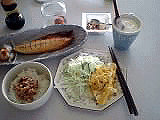 さば塩焼き&大根おろし、卵スクランブル&キャベツ千切り、梅干し、ごはんの上に納豆、デザートはキウイ&ヨーグルト。先日買い換えた携帯電話の内蔵カメラで今朝のメニューを撮影。6年前に買って以来ずっと使い続けているサンヨーのデジカメ(81万画素)より画素数が多いのだ。