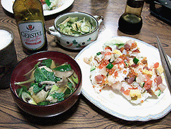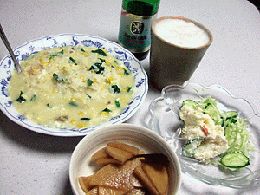 昨晩のうどんは、やはり“1玉”にすべきだった!?そんな反省のもと、今宵も途中下車、しかも2駅前の八柱駅からチャレンジするが、けっこう騒々しい県道を歩くためにどうにも風情(ふぜい)がない。家までの所要時間30分は常盤平駅から歩くのと大して変わらず、やはり次回から静かな常盤平団地を散策しながら帰ることにしよう。その常盤平団地は外壁も薄汚れてずいぶん長い間、補修していないようだ。高層団地への建て替え構想があるため、引っ越して部屋が空いても其処に新たに住まわせないようにしているとの噂も聞く。そのためかどうかわからないが、窓明かりも少なく、街灯は薄暗く、行き交う人も少ない。ウチラが居た当時はもっと活気があったような気がするが、静かすぎる。夜、暗がりを歩くのはちょっと恐い雰囲気があるぞ。昨晩に続いて連続“休肝”日!!西洋風リゾットにポテトサラダ、例の特製「大根醤油漬け」も添えてみよう=写真手前。独レーベンブロイ・アルコールフリー(アルコール分0.5%未満)330ml。