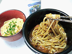 朝、小雨。それでもテニスに行こうと準備した途端に、雨脚が強くなる・・・。「こんな日はおとなしく家にいてピアノ練習するべし」とお天道様のご託宣か?!はいはい、わかりました♪♪・・・。亀城庵さぬきうどん300gを茹でてカレーうどんと釜玉うどん=写真=の昼食、缶ビールもひとつ。雨も止んだようで曇天下、2時間ばかりウオーキング&ジョギングでカロリー消費!と勇躍外出してみたが、なんと途中でジョギングシューズの靴底が剥がれてしまって“ペロンペロン”になってしまったので40分で中断。再び雨も降りだした。あ〜あ、残念、退却やむなし。さて笹やんがゲスト出演するコンサートが夕方5時から開演の「ティアラこうとう」小ホール(=錦糸町から半蔵門線で一駅、住吉駅徒歩3分)に出かける。ピアノ調律師の村上武士さんが主催するアマチュア参加のセッションで、今回初参加した笹やんは1960年製スタインウエイ・フルコンサートピアノでジャズボーカルの伴奏もこなしつつ、最後にプロの腕前を披露したのでありました。それにしても独り2〜3曲歌うジャズボーカルのおばさんパワーには少々辟易(へきえき)したというのが正直な感想であります。帰宅22時、カレーライス&ロング缶の遅い夕食。