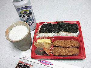 涙の土曜出勤日。どうせ東京に出るのならと、夕方から笹やんピアノレッスン“補講タイム”(また、大汗!)。三枝子さん、本日は帰りが遅い。夕食はどうしようっか?逡巡の結果、五香駅前商店街「オリジン弁当」で購入したのは、のり串揚げ弁当(399円)=写真。ヒレカツ使用の串揚げで、これがなかなかいける!野菜不足を補うため、冷蔵庫にあった韓国直輸入・白菜キムチ(先般、問題になった回虫の卵はないことを願う!)にもちょっかいを出してみるが、・・・。ちなみにキムチは、滅多に食べない“おいらの食わず嫌い”の一品。あの辛さは小生には合いませんな。ロング缶2つ&焼酎お湯割り。