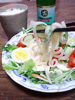 梅雨の先駆けのようなこの天気は「はしり梅雨」と言うんだそうな。本日、勇気を出して連チャンの“休肝”日!にしようっかな?カトキチ冷凍さぬきうどんを使って、サラダうどん=写真。青じそノンオイルドレッシングとマヨネーズがよく合う。これから夏はサラダうどんで決まり!!そして独レーベンブロイ・アルコールフリー(アルコール分0.5%未満)330ml。フランスパン1切れ、田舎五目いなりも少々。