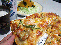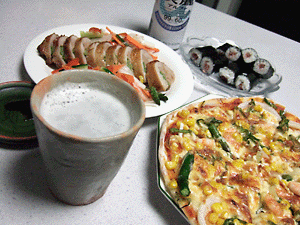 夕食は、チキンロール、鉄火巻、そして3日目となった特製ピザ(=写真)&麒麟淡麗アルファ・ロング缶2つ。実はこの豪華さ(?)の原因は、6月7日、すなわち我等の結婚記念日30周年にあったのだ。