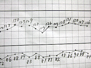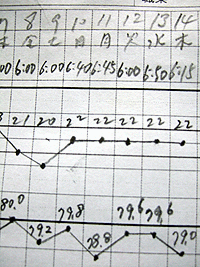 高血圧と言われた3月15日以来、降圧剤「アムロジン」を毎朝1錠飲んでいる。それに伴って毎朝の血圧チェックも欠かさず続けている=左グラフ。これと体重計測(右の写真)をセットにして記録しているわけだが、会社の診療所の先生が「これはすばらしい。このままスライドにして学会に発表したい」などとおっしゃる。自己健康管理と減量努力を誉められた。といっても、また1ヶ月分の「アムロジン」を処方するのであった。