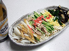“もちもち”の食感がお気に入りのカトキチ冷凍さぬきうどんを茹でて、サラダうどん&混ぜご飯&オランダ産「バクラー(Buckler)」=アルコール度数約0.5%のビールテイスト飲料。
