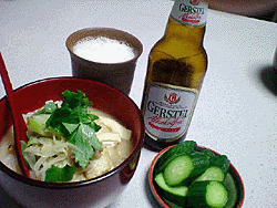 写真右は夕食の深川丼と自家製キュウリ糠漬け。深川丼はクッキングレシピを見ながら三枝子さんが挑戦した力作である(ヨイショ!)。ビールテイスト飲料はお馴染みの独「GERSTEL