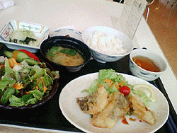 写真左は昼食。社員食堂の「ヘルシー定食(398kcal)」(たら天ぷら&ゆでキャベツ、ご飯150gきっちり=400円。それにブロッコリー明太サラダ(84kcal)=150円、一見、豪華そうに見える?
