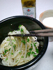 本日、今週2回目の“休肝”日!カトキチ冷凍さぬきうどんを2玉茹でて、熱湯で「ヒガシマル粉末つゆの素・うどんスープ」を溶き、細ねぎを刻んで「素うどん」風に。うどんスープは関西風のまろやか味でグッド。熱いうどんを一気にすすり上げる。まいう〜!添え物は独レーベンブロイ・アルコールフリー(アルコール分0.5%未満)330ml。