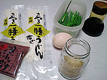 材料を用意します=写真左。「亀城庵さぬき一膳うどん(並麺120g)」を2袋、大鍋のたっぷりした湯で茹でます。6分経って、うどんを半分取り出してそのまま玉子と絡ませて刻みねぎ、ごま、醤油を加えれば「釜玉うどん=写真中央=」の出来上がり。さらに鍋に残っているうどんを4分間茹で続けたあと水洗い、ごま、刻みねぎ、たっぷりのおろし生姜を載せて「冷やしぶっかけ」のたれをかければOK=写真右。苦労(?)した割には、あっという間に両方とも平らげてしまった。さぬきうどんは“のどごし”が勝負!ビールテイスト飲料はお馴染みの独「GERSTEL