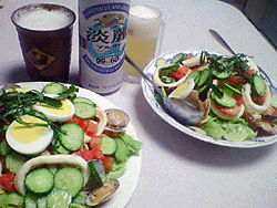 朝、東洋学園大コートに出動は8時半。10時までテニス、大汗。「ココス」小金原店で朝・昼食。朝から空気が湿っぽく雨が降りそうな気配もあったが、結局、雨降らず。午後は「健美の湯」で2時間。お風呂上がり77.2kgの体重計表示。帰宅、ところてん&麒麟淡麗アルファ・ロング缶を一気飲み・・・。いんげん胡麻和え、さんま酢漬け、茄子・ピーマン味噌炒め、納豆&おくら、追加のロング缶と焼酎お湯割り。