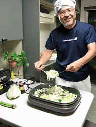 夕飯は、タオルを頭に巻いて焼きそばづくり=写真左。ロング缶3つ&焼酎水割り。明朝の体重減は期待できず・・・・??