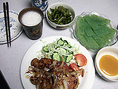 涙の土曜出勤日。夕飯は「お盆なのに、土曜出勤ご苦労様」と、ポークソテー2枚=写真=の豪華メニュー!?枝豆、刺身こんにゃく。しかしこれは、おいらを太らせようと三枝子さんの謀略か?