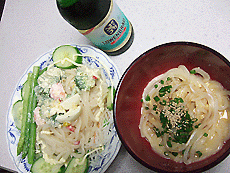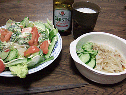 今週第1回目の“休肝”日。「亀城庵さぬき一膳うどん/細麺120g」を2袋茹でて、サラダうどんと冷やしぶっかけうどんでいただく=写真。ビールテイスト飲料はお馴染みの独「GERSTEL