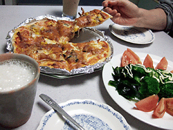 やっとこさ直りつつある足指がまた腫れたら嫌なので、“日曜日恒例”の「健美の湯」もしくは「柏自然温泉 長寿の湯」は自粛。とりあえず衆院選の投票に行って帰宅後、シャワーで汗を流して缶ビール1つ。15時前、にわかに暗雲、雷轟き、ざあっと雨が1時間くらいか?その後、ソファで半分寝ながら女子プロゴルフのテレビ観戦。夕食は久しぶりの三枝子さん特製ピザ=写真、麒麟・淡麗アルファのロング缶&350ml缶。開票速報を観ながら、とろろそば。