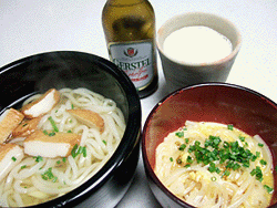 夕食メニューは、おなじみ亀城庵のさぬきうどん・並麺1袋(300g)を茹でて、釜玉うどん(右)と熱々かけうどん&ごぼう掻き揚げ天(左)でいただく。まいう〜!!ノンアルコールビールを冷やしておくのを忘れた!食後に黒豆茶。