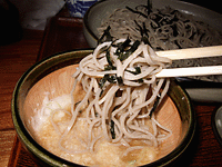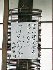 ペンション朝食後、雨そぼ降るなか、9時から11時まで室内コートでテニス。中軽井沢の星野温泉「トンボの湯」にて汗を流す。昼食は追分の蕎麦屋「ささくら」で、つけとろろそば=写真上参照、追分宿・加賀屋手作り豆腐(315円)、ビール中ジョッキ。ここで中田パパとお別れ。