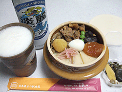 今週2回目の“休肝”日。“お馴染み”さぬきうどんは小休止、ヨーカドーで買ってきたおかず(酢の物、海老真丈(しんじょう)湯葉巻き)で、ごはん軽く一杯。独レーベンブロイ・アルコールフリー(アルコール分0.5%未満)330ml。
