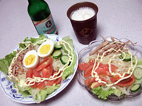 今週2回目の“休肝”日。おなじみ「亀城庵」のさぬきうどん・並麺1袋(300g)を茹でて、得意の「サラダうどん」に仕上げる。三枝子さんにもおすそ分け(=写真右側のゆで卵が載っていない方)。阪神の岡田監督胴上げシーンを観ながら、独レーベンブロイ・アルコールフリー(アルコール分0.5%未満)330mlとともにいただく。