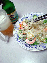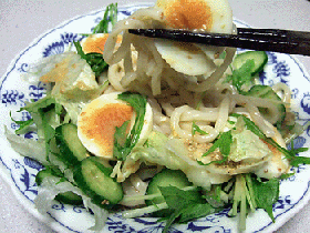 とする。「亀城庵さぬきうどん・国産小麦うどん 薫」(並切麺)240g=つまり、1袋全部=を茹でて、釜玉うどんとサラダうどん=写真=でいただく。独レーベンブロイ・アルコールフリー(アルコール分0.5%未満)330ml。