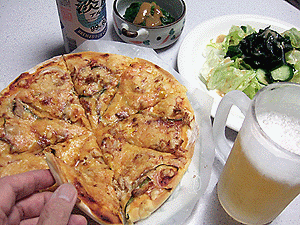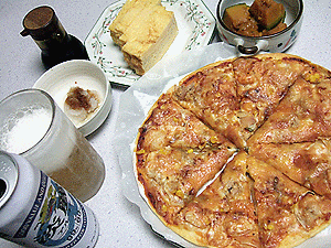 涙の土曜出勤日・・・。昼は、いつもの「リトル小岩井」のスパゲティ、バジリコ。夕刻、妾宅に寄らずに(?)まっすぐ帰宅すると、久しぶりに三枝子さん特製ピザが待っていた=写真。ロング缶2つ&焼酎お湯割り。これで、あと2日分のピザ生地が残っているので、お楽しみはまだ続くというわけですな。