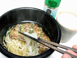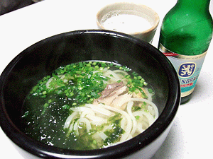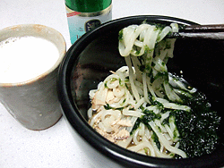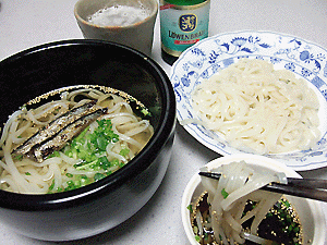 今週2回目の“休肝”日、三枝子さんとのお約束で今週もう1回“休肝”日が残っているが、それは金曜日にしましょう。さて今宵は、亀城庵「さぬき本膳うどん」並麺300gの半分150gを茹でて、ほぐした「姫かつお」、水で戻した「青さのり」をのせて「温ぶっかけ」のたれをかければ「ぶっかけうどん」=写真=の出来上がり。海苔の風味は強烈だが、見た目はあまりおいしくなさそうかな?ぺロッと食べてなにかモノ足りないので稲荷寿司を少々。独レーベンブロイ・アルコールフリー(アルコール分0.5%未満)330ml。