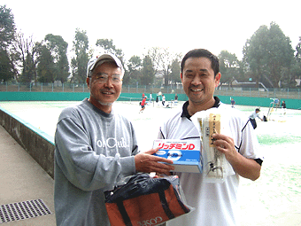 我がホームページのナンバーゲット作戦で44443番ゲットして44444番をクリックしなかったT森くんに景品進呈するために、朝6時50分に栗が沢コートに出動。仕事のため7時30分に帰るT森くんへの贈呈式も無事終わり=写真、その後も9時までテニスしたが、普段より30分位も早く来たわけでプレー時間がやけに長く感じる。大汗。アイスクリームサービス券につられて「ココス」でモーニング(ドリンクバー付)。そのあとは「健美の湯」での〜んびり。