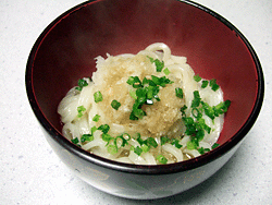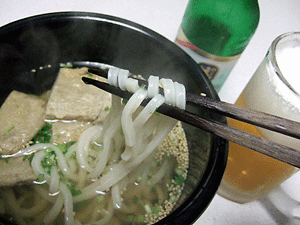朝の冷え込みが一段と厳しくなった。法事以外にネクタイをしたことがない(もう5年以上?記憶がない)首筋あたりが冷え冷えする。昼は社員食堂で海鮮丼(マグロ、イカ、ホタテ刺身)。今週最初の“休肝”日。夕食は亀城庵「さぬき本膳うどん」太麺300gの半分150g(一昨日の残り)を茹でて、「冷や熱うどん」の天ぷら入り=写真=とする。独レーベンブロイ・アルコールフリー(アルコール分0.5%未満)330ml。「お稲荷さん」を少々。