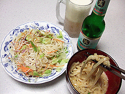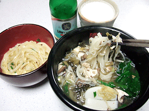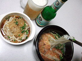 夕食はタッキー鍋=写真。すでに御存知の方は知っている!?ごま油を敷いて、もやし、豚肉、もやし、にら、そして塩、コショウ、さらにごま油をかける。それで12〜3分ふたをして蒸す。これで「タッキー鍋」のできあがり。肝心なのはポン酢で食べること。“タッキー”こと滝沢秀明さまご紹介の簡単料理。ロング缶2つ&熱燗。
