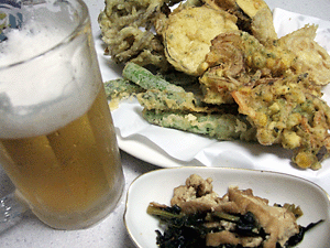 夕食は野菜の天ぷら、大根の葉っぱと厚揚げ炒め、ロング缶2つ&350ml缶。焼酎お湯割り。