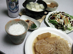 夕食は、大根煮物、湯豆腐、竹輪とキュウリのサラダ、ロング缶&350ml缶、熱燗。