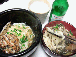 今週2回目の“休肝”日。夕食は亀城庵「さぬき本膳うどん」太麺300gはちょっと多いので、少し残して約220g(推量)を茹でて、ホクホクの「釜玉うどん」と「熱々うどん」=写真=とする。まいう〜。ノンアルコールはサントリー「ファインブリュ−」アルコール分0.5%未満350ml缶、こっちはやっぱり不味いや。明日、独レーベンブロイ・アルコールフリー(アルコール分0.5%未満)330mlを購入すべし。