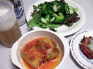 朝、八が崎室内コートでテニス、大汗。コーヒータイム10時過ぎまで。昼は滅多に食べないインスタントラーメン「明星チャルメラ」、野菜を具沢山に、茹で玉子を半分。そしてピアノ練習。昨日に続いて三枝子さん共々「21世紀森の公園」へウオーキングタイム2時間。ちょっと小雨あり。歩くだけに飽き足らず、ジョギング少々。今日こそ銭湯「平和湯」へ。サウナ後の計測76.2kg。体脂肪率21。夕食は三枝子さん特製ロールキャベツ=写真、お代わりをして合計4つ。ブロッコリーサラダにさつま揚げ、ロング缶2つ&焼酎お湯割り2杯。お茶漬け、さらにこっそりと350ml缶ひとつ。